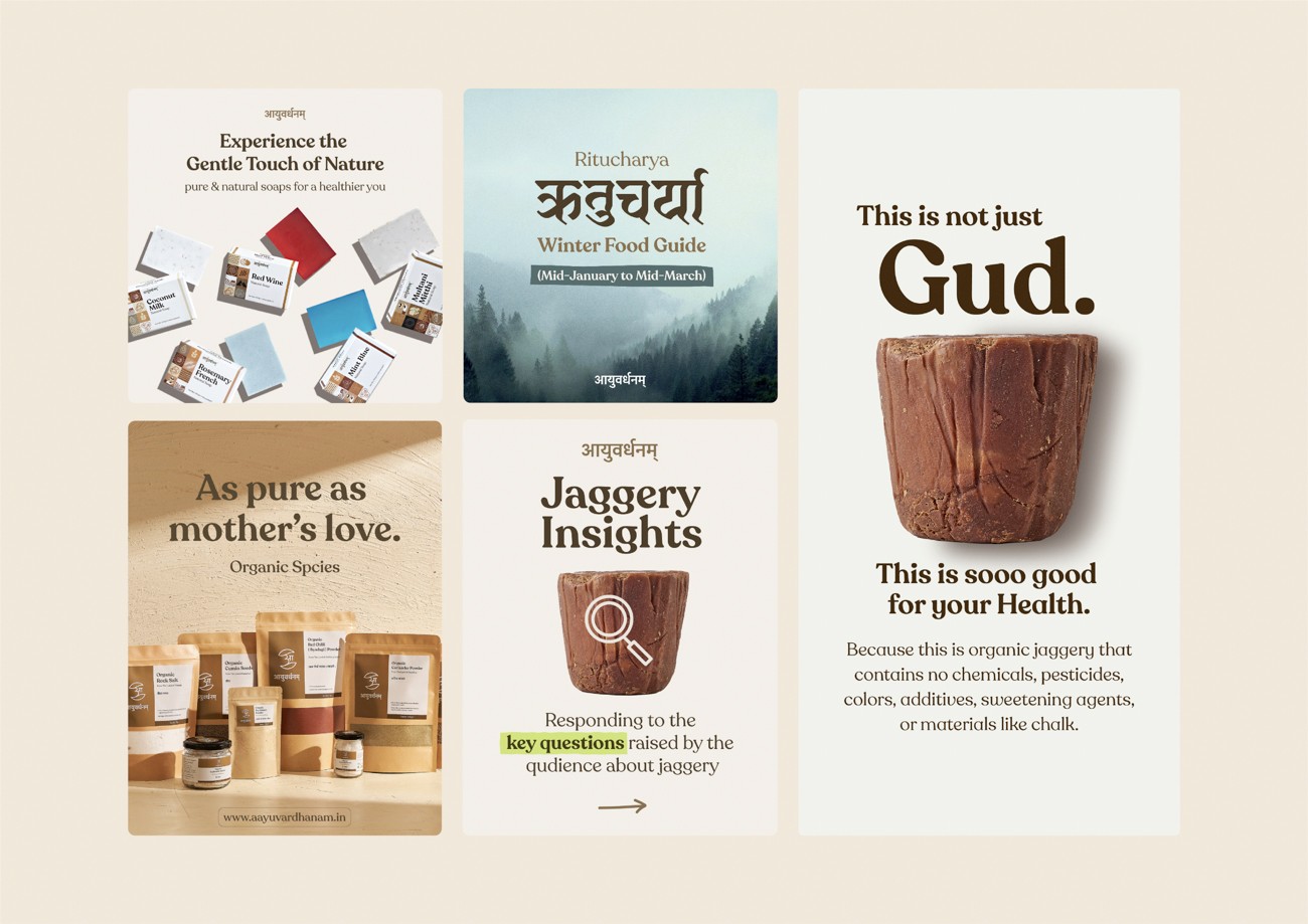 This research became the first spark for the brand’s visual strategy. It guided us to preserve a traditional and grounded touch within the visual language of Aayuvardhanam.