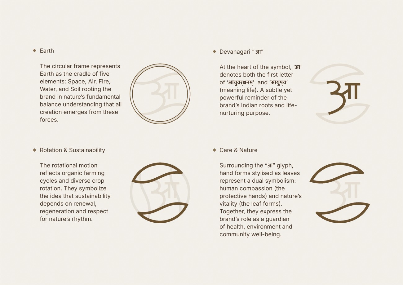 Colour is one of the most powerful tools for shaping perception, and for Aayuvardhanam, it became a visual embodiment of the brand’s philosophy. We deliberately chose a warm, earthy palette anchored in soil brown, soft beige cream and muted natural tones to reflect the farming-first values at the heart of the brand. These hues don’t simply complement the logo; they carry the story of the land, the harvest and the trust between farmer and consumer.