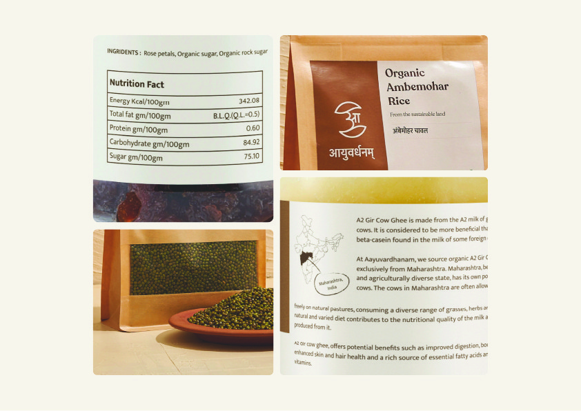 On the front, we boldly displayed the origin of each product — naming the specific region it came from and included key benefits to gently educate and guide even those unfamiliar with organic choices. To deepen cultural resonance and ensure compliance, we placed the Devanagari version of every product name alongside English, weaving tradition into modern design. This considered approach not only honours Aayuvardhanam’s cultural roots but also positions the packaging as future-ready, authentic, and aligned with the brand’s greater purpose.