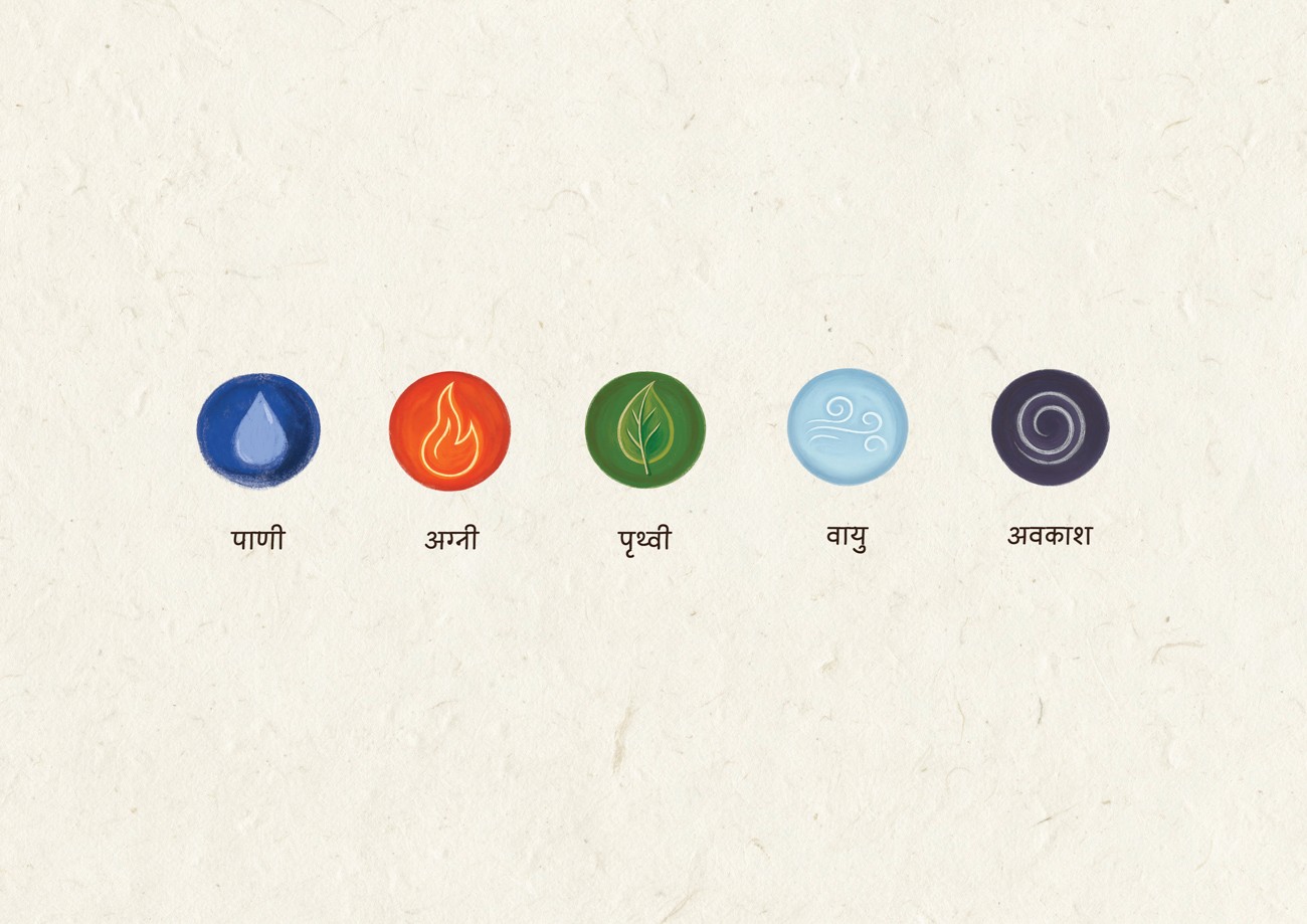 The extended palette draws inspiration from the Pancha Mahabhuta, the five elements of Indian philosophy. Hand-painted textures represent Agni, Vayu, Paani, Pruthvi, and Aakaash to ground the brand in cosmic balance.