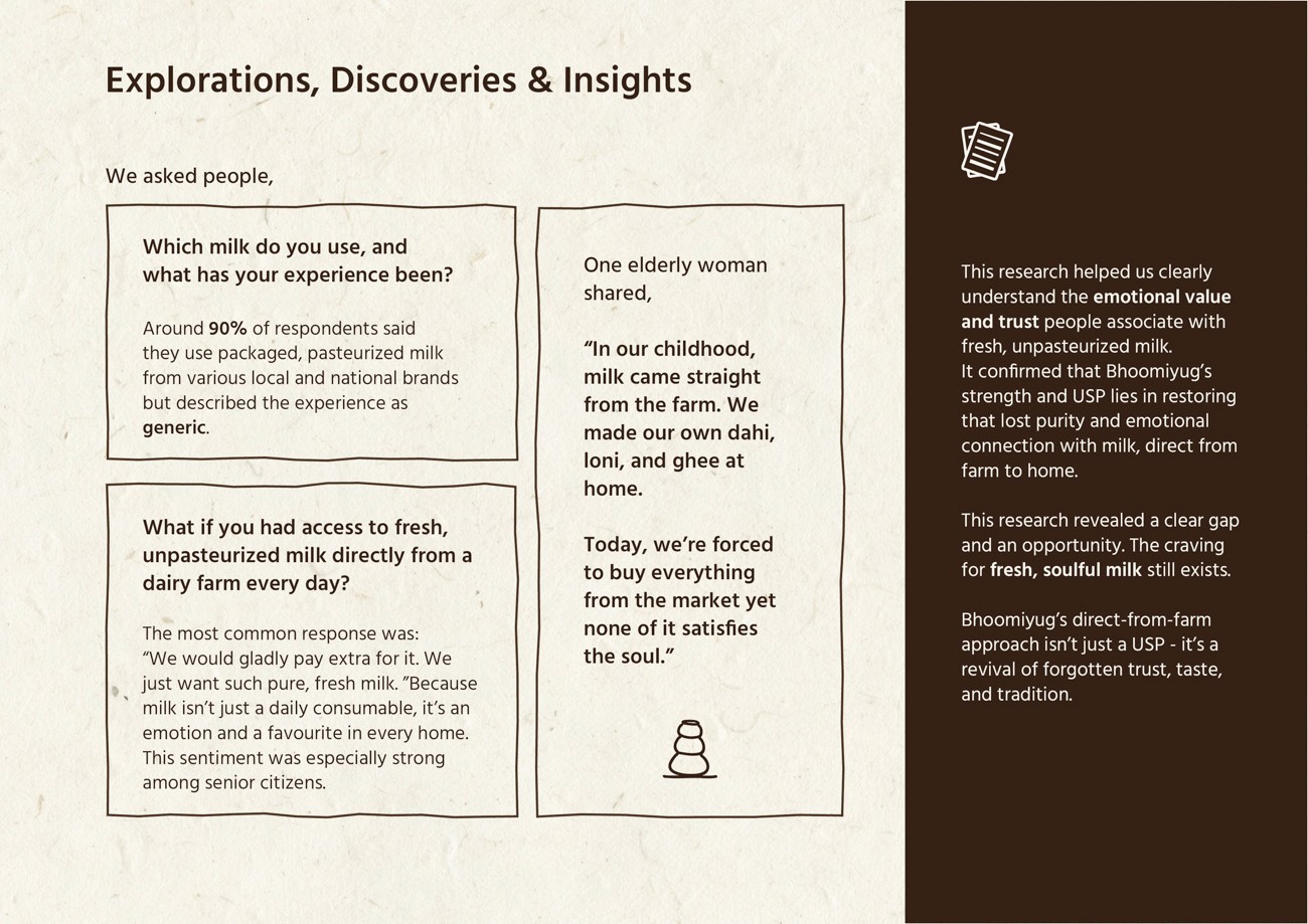 Extensive regional research exposed a critical gap in the dairy market. While 90% of consumers rely on generic pasteurized brands, satisfaction remains low. Interviews confirmed a profound nostalgia for the "soul" of traditional milk, specifically its unadulterated taste and ability to yield superior by-products like ghee and curd. Retailer conversations further highlighted a commodity trap where incumbent brands are indistinguishable, competing on logistics rather than quality.