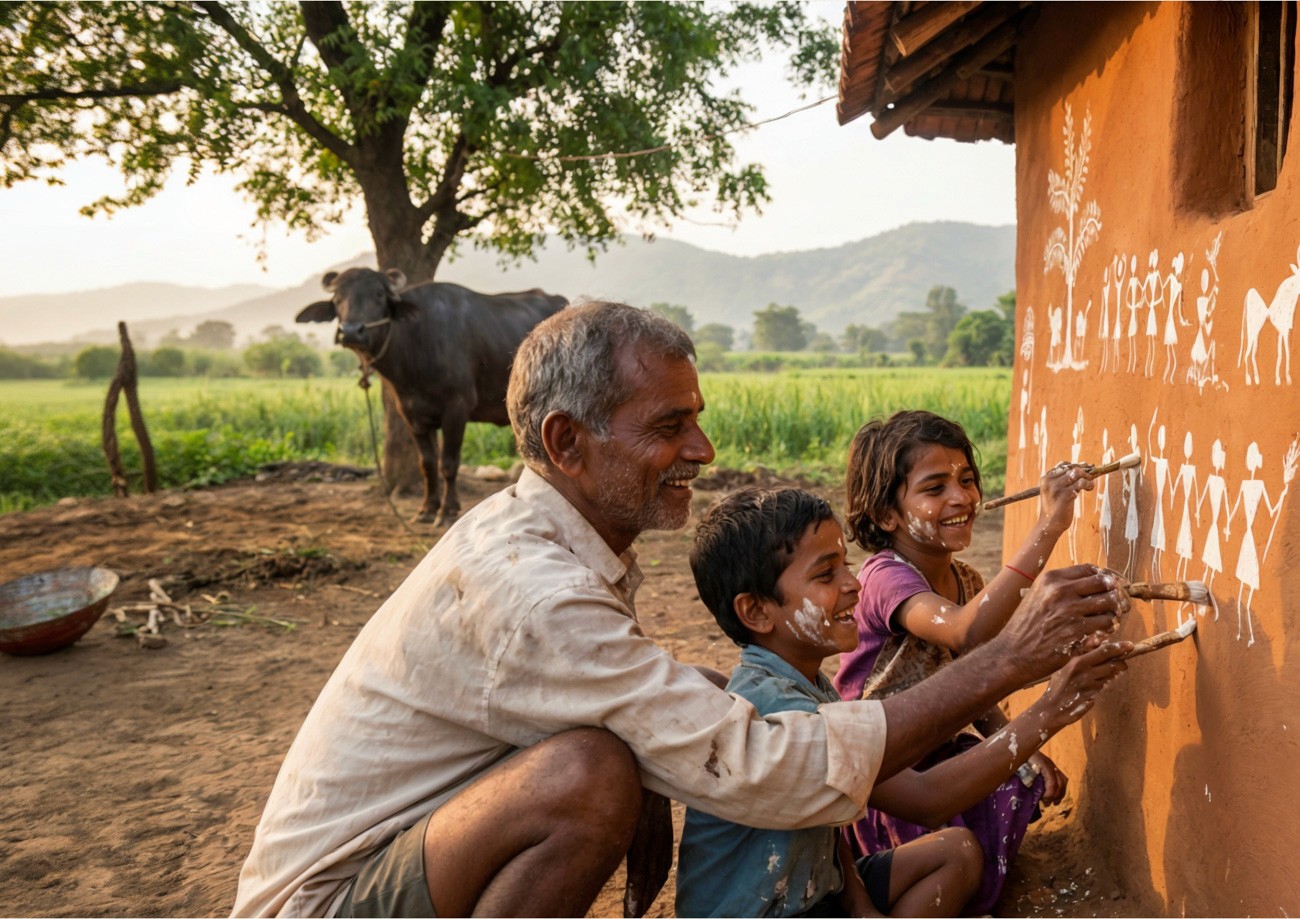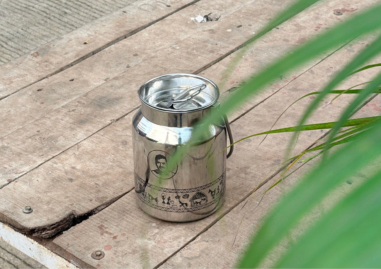 The design features a continuous illustration band inspired by Warli tribal art. This visual loop functions as a memory circle, chronicling the holistic cycle of agrarian life: sowing seeds, nurturing livestock, and the final act of humble delivery.