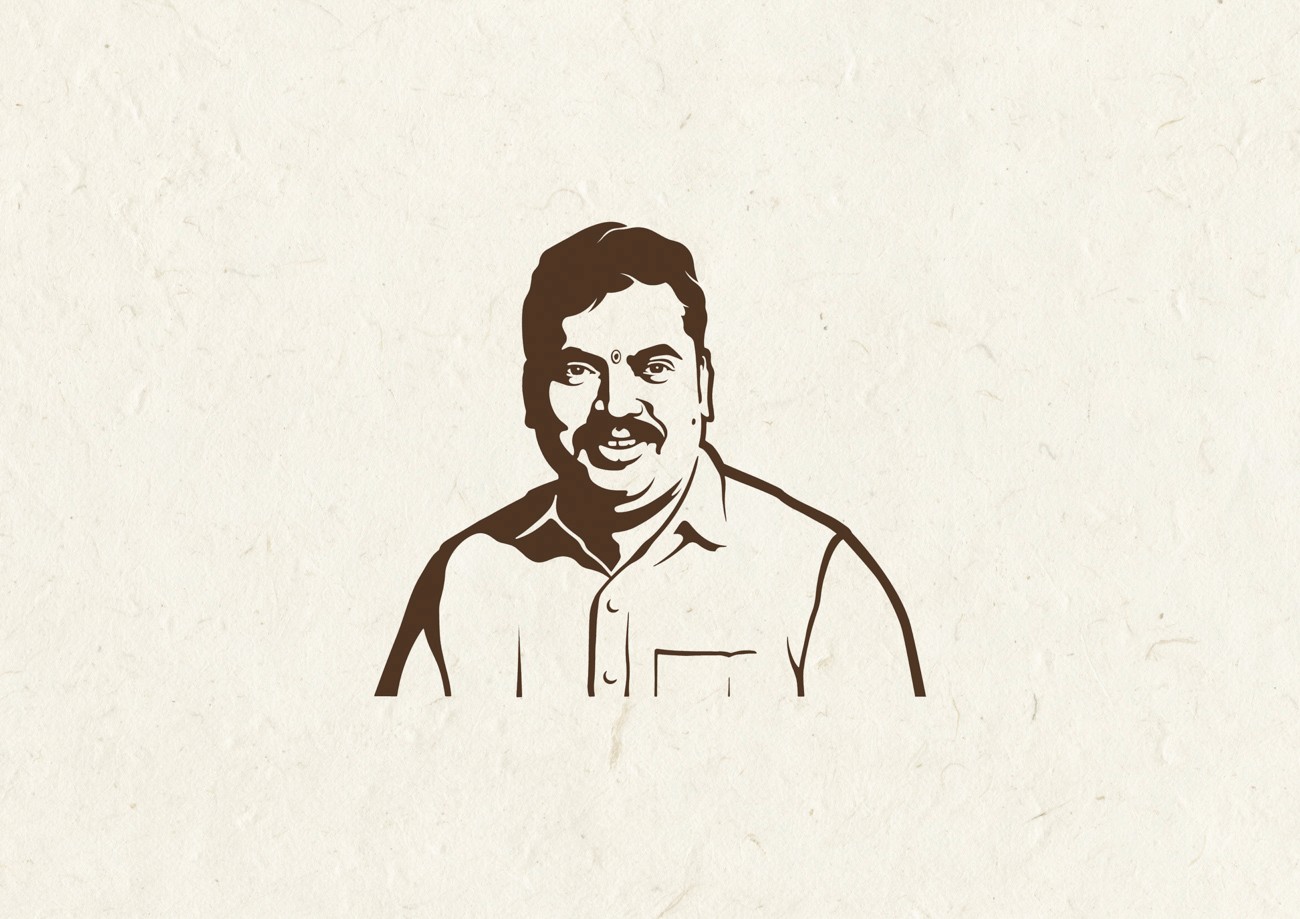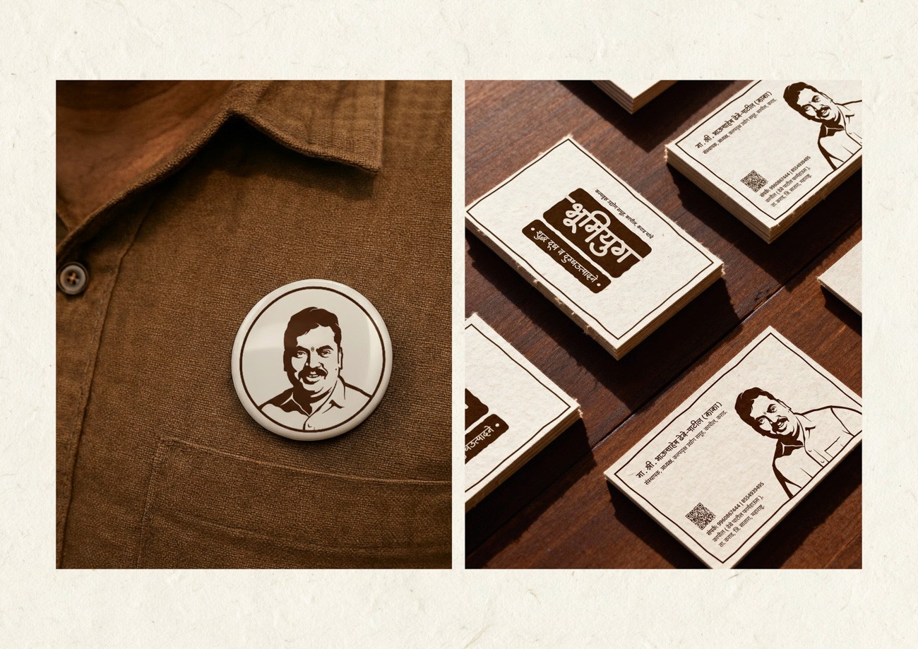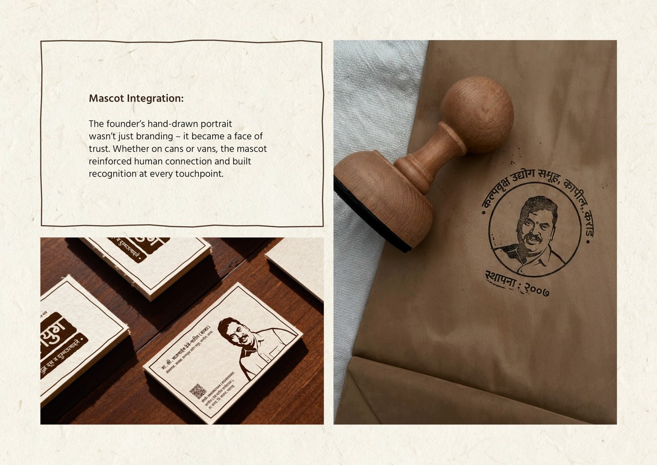 To humanize the visual system, the design team developed a mascot modeled directly on founder Bhausaheb Dhebe Patil. This portrait acts as the brand's emotional anchor and personifies its commitment to trust and agrarian stewardship.