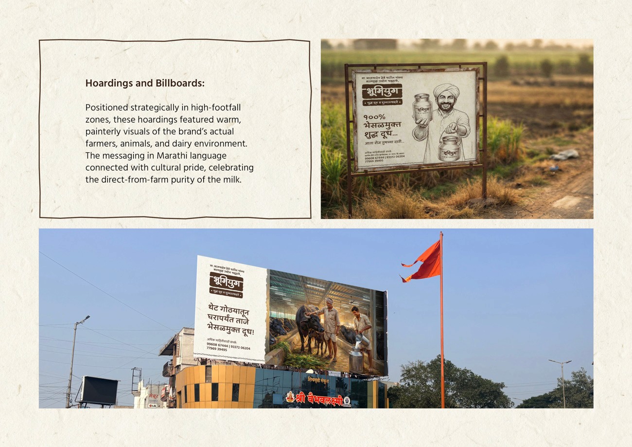 Delivery vehicles were transformed into moving storytellers, carrying the brand promise across neighborhoods. Outdoor hoardings featured artful renderings of dairy scenes, bridging authenticity with aspiration in high-footfall zones.